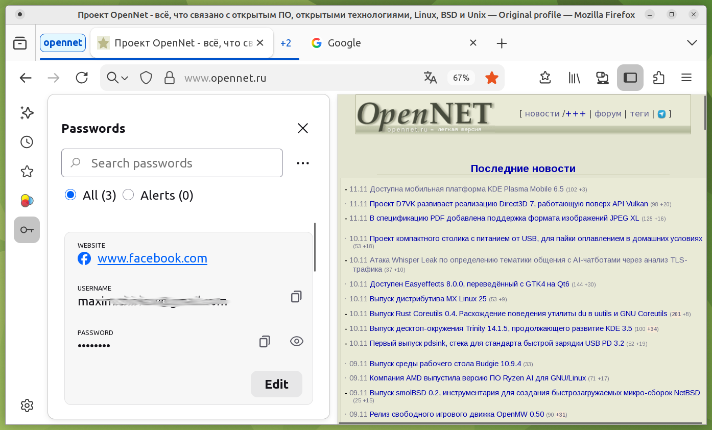 - Добавлена поддержка провайдера хранения паролей oo7, поддерживающего API Secret Service.